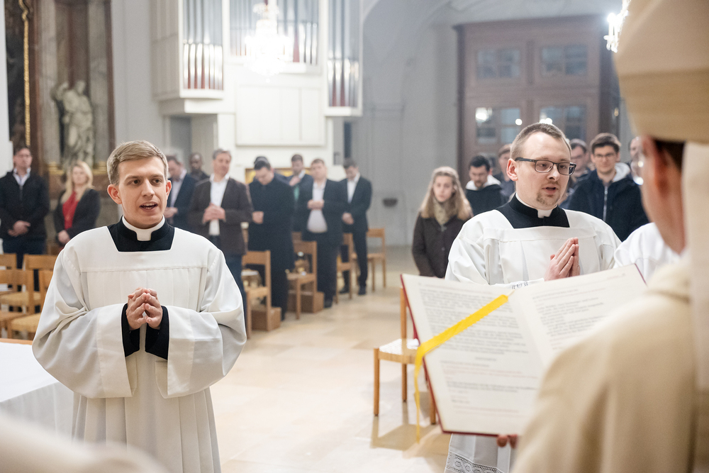 Die Admissio ist ein bedeutender Schritt auf dem Weg zur Weihe. In einer feierlichen Liturgie wird der Kandidat offiziell in die letzte Phase der Vorbereitung auf das Weihesakrament aufgenommen. Mit diesem Akt bekennt der Kandidat öffentlich seine Bereitschaft, den Dienst in der Kirche anzunehmen und seinen Weg der Berufung weiterzugehen. Diese Feier drückt die Anerkennung der Kirche aus und stärkt die Verbindung zwischen dem Kandidaten und der Gemeinschaft. Durch Gebet, Segen und Zuspruch wird der Kandidat auf seinem weiteren geistlichen Weg begleitet und ermutigt. Unter die Weihekandidaten aufgenommen wurden die Seminaristen Florian Gründker und Constantin Mucha. Wir waren mit der Kamera dabei.